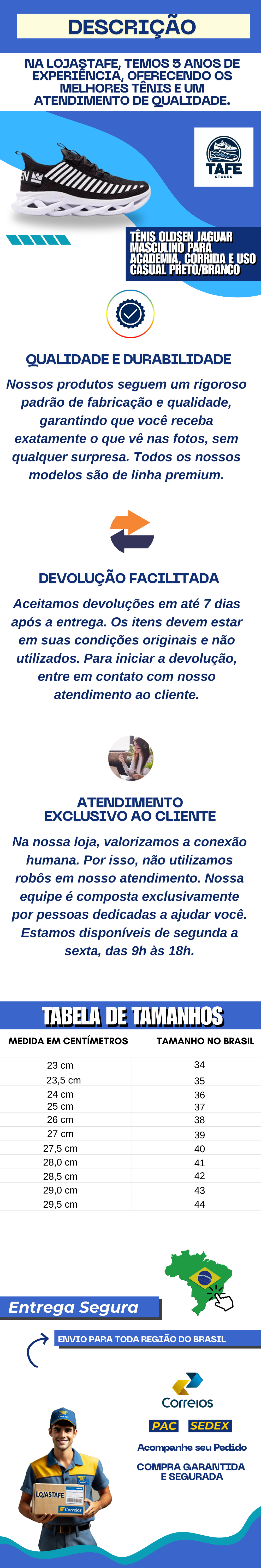 O Tênis Oldsen Jaguar Masculino Preto/Branco é a escolha certa para academia, corrida e uso casual. Seu design moderno oferece conforto e suporte nos treinos, desempenho nas corridas e versatilidade no dia a dia. A combinação clássica de preto e branco garante estilo em todas as ocasiões.